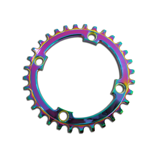 PVD Titanium Rainbow coating for motorcycle accessories (sprocket). Our team is capable of creating the ideal coating for your industry.